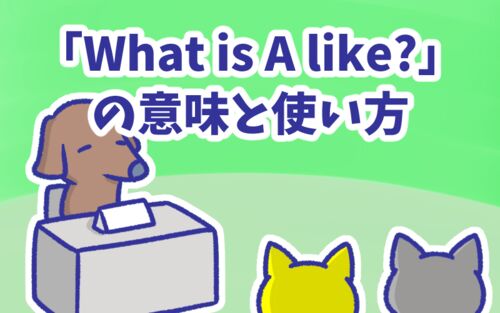 今回は英語フレーズ「What is A like?」の意味と使い方を勉強しよう。 「Aは何が好きですか?」かな。 いや、このフレーズの like は動詞の「好き」という意味ではないよ。